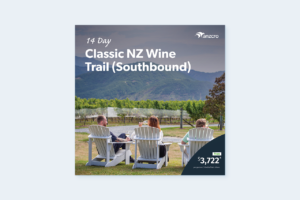 Discover New Zealand’s iconic wine regions on this immersive 14-day self-drive journey from Auckland to Christchurch. From Rotorua’s Skyline gondola and wine tasting to Hawke’s Bay’s Art Deco gin and wine tour, Martinborough’s boutique cellar doors and Wellington’s craft brewery scene, each stop blends flavour with local character. Cruise the Cook Strait to Marlborough for world-class sauvignon blanc, then continue along the dramatic Kaikōura coastline before finishing in Christchurch — all enjoyed at your own pace with comfortable stays and the freedom of a Toyota RAV4 with ULTRA cover.